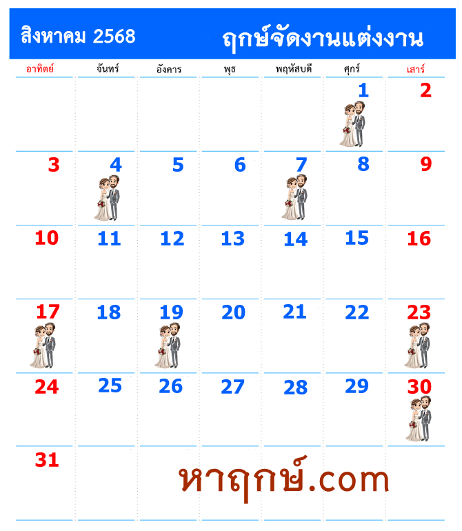 หาฤกษ์ จัดงานแต่งงาน เดือน สิงหาคม 2568 |